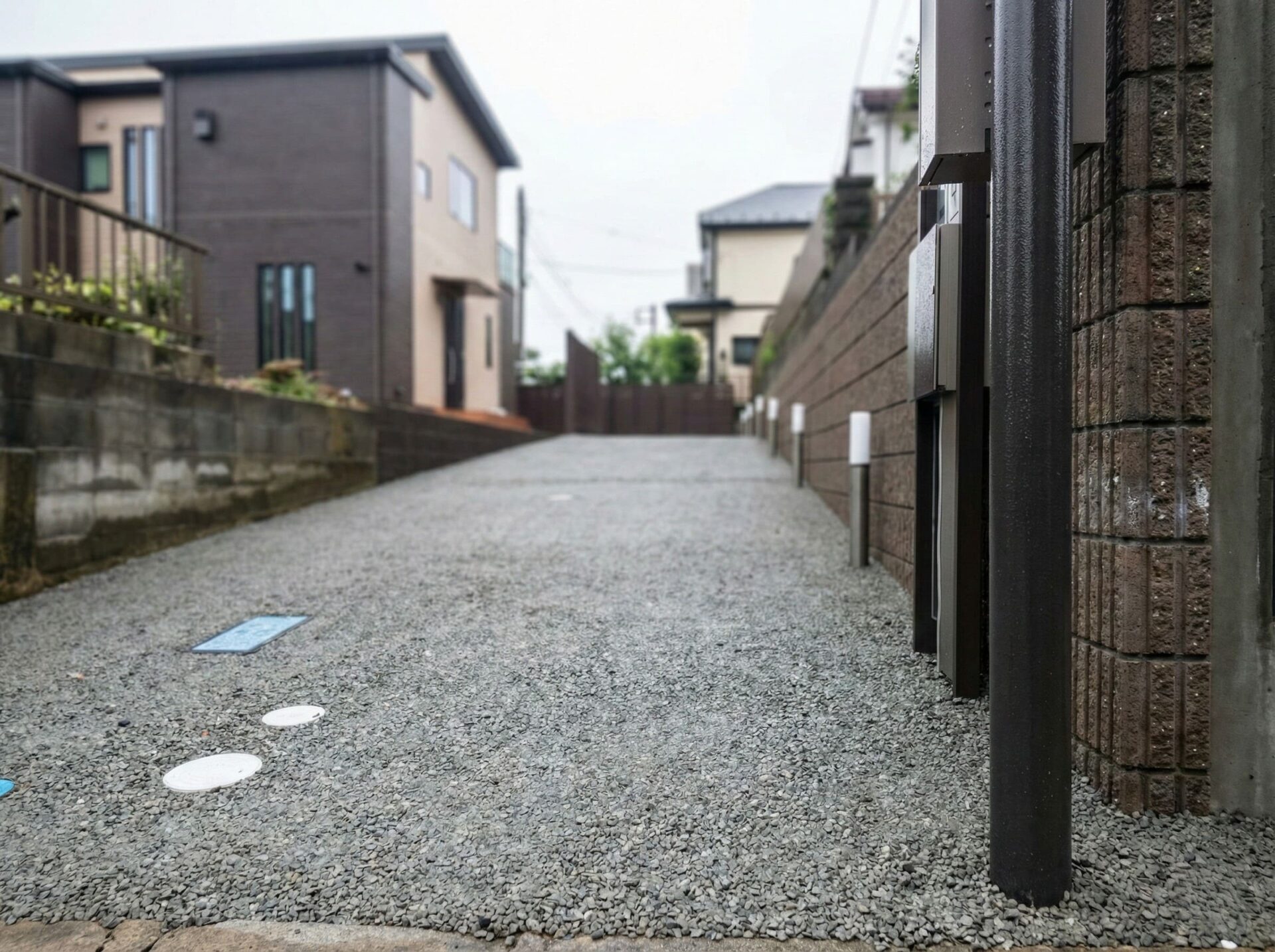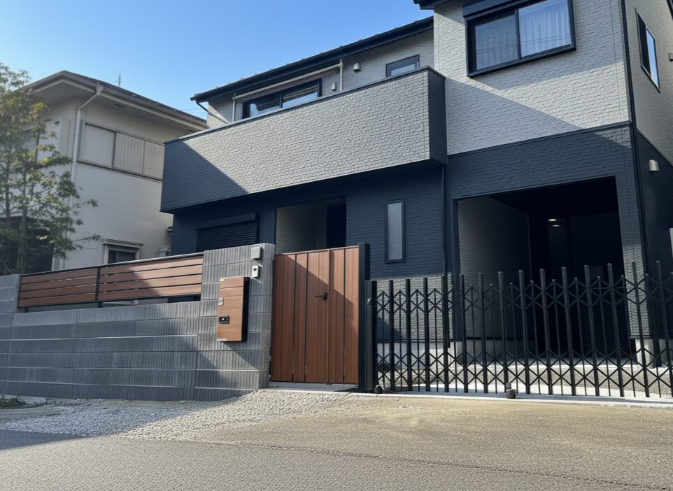 相模原市の新築外構|ノイズレスな機能美。黒の機能門柱と「透水性」が叶える都会的ファサード